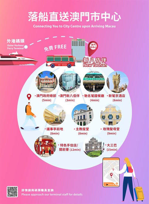 从即日起,所有乘客抵达澳门外港码头后,即可立即乘车穿梭澳凼,下车位置邻近澳门新八佰伴、新葡京酒店,5至15分钟内更可步行至各个旅游景点、人气食店及打卡点,让您轻松畅游澳门。
